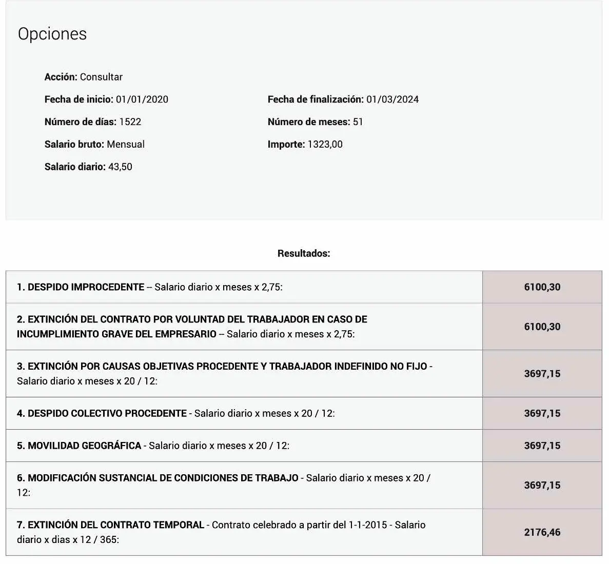 En la siguiente imagen se presenta un ejemplo de un trabajador que ha estado en la misma empresa desde el 1 de enero de 2020, con un salario mínimo interprofesional (SMI) de 1.323 euros brutos mensuales en 12 pagas, y que fue despedido el 1 de marzo de 2024. Esto te permitirá ver cómo se muestran los resultados en la calculadora del CGPJ, a la que puedes acceder mediante este enlace.